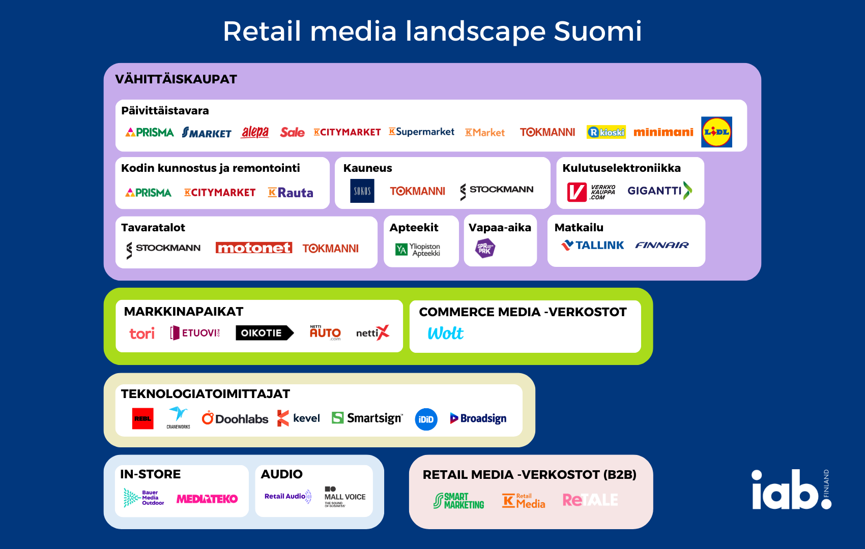 IAB Finlandin retail median työryhmän laatima kooste avaa, miten markkina rakentuu ja keitä toimijat ovat vähittäiskaupasta markkinapaikkoihin ja teknologiatoimittajiin. Koosteen tavoitteena on palvella kaikkia alan toimijoita sekä auttaa suomalaisia ja kansainvälisiä markkinoijia, mediatoimistoja ja brändejä hahmottamaan: