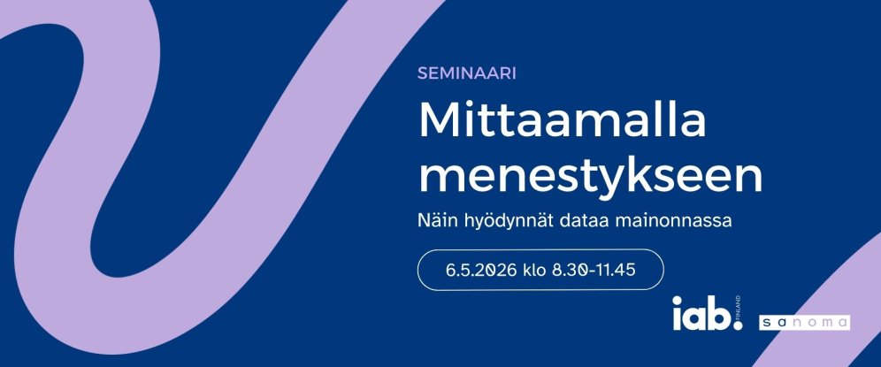 Data on digimainonnan menestyksen keskeinen ajuri. IAB Finlandin dataan ja mittaamiseen keskittyvässä seminaarissa pureudutaan siihen, miten dataa voidaan hyödyntää kilpailuedun rakentamisessa, vaikuttavuuden kasvattamisessa ja mediakentän haasteiden ratkaisemisessa.